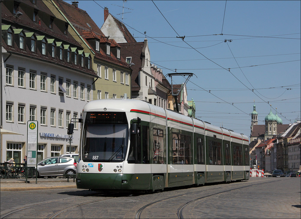. CityFlex-Straßenbahn 887 am Augsburger Ulrichsplatz. Die CityFlex-Tram gehört zur Cityrunner-Familie von Bombardier. 2605.2012 (Matthias)