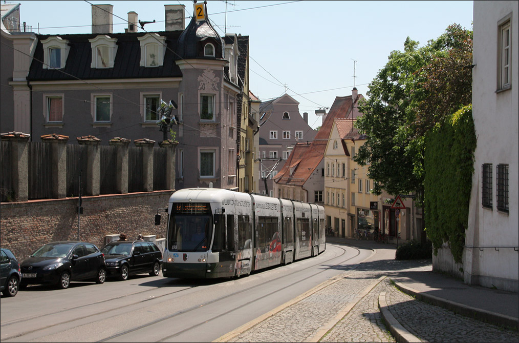 . Eine CityFlex-Straßenbahn erklimmt den Milchberg in Augsburg. 26.05.2012 (Matthias)
